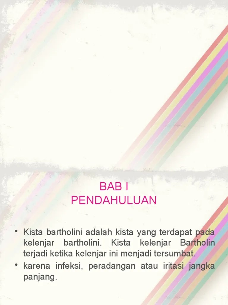Pptx), pdf file.pdf), text file.txt) or view presentation slides online. Kista bartolini merupakan kista yang terbentuk akibat adanya sumbatan pada duktus kelenjar bartolini yang menyebabkan retensi dan dilatasi kistik. Hal ini berhubungan dengan aktifitas kelenjar bartholin yang berkurang pada masa menopause. Chronic inflammation can lead to ductal obstruction from pus or thick mucus which in turn can result in retained secretions within the bartholin glands. Kista bartholini terbentuk akibat tersumbatnya kelenjar minyak dibibir kemaluan bagian dalam (ada dua, di kiri dan kanan) akibat adanya infeksi.